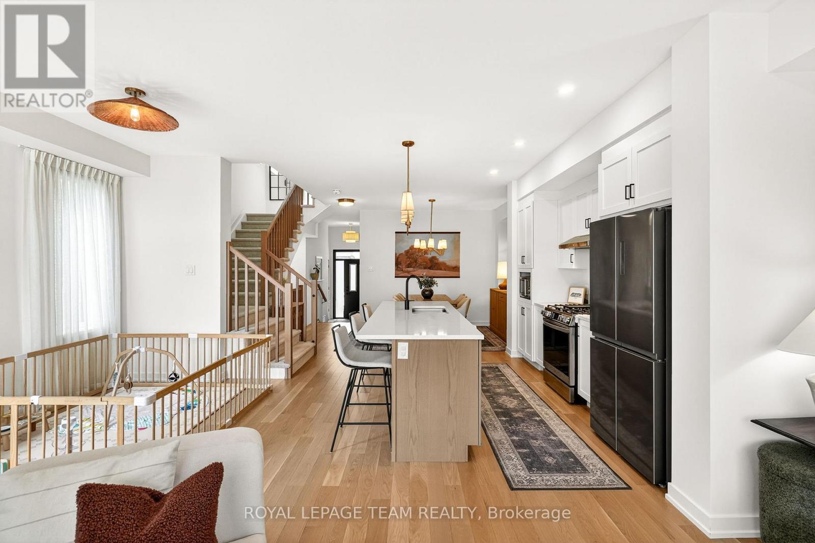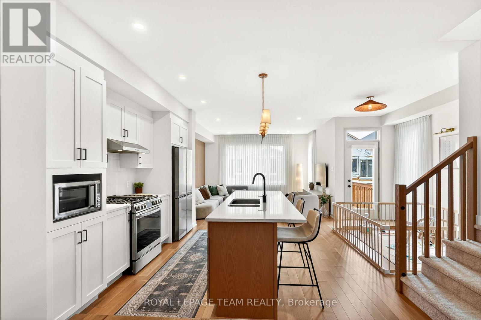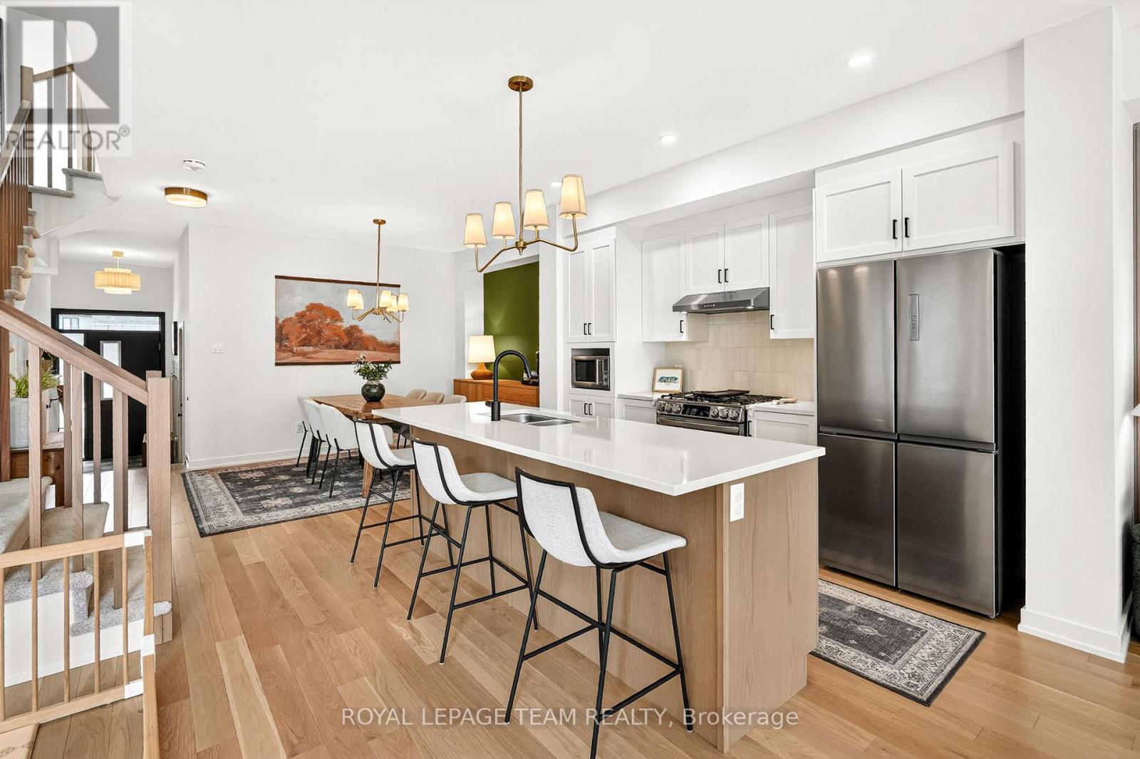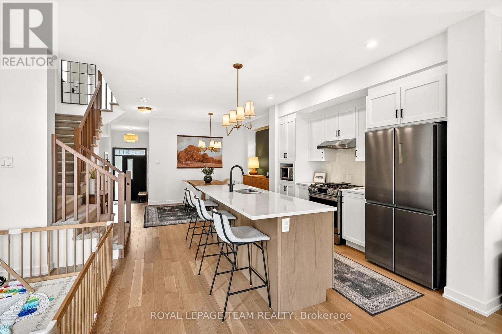Welcome to 1009 Acoustic Way, a stunning 2024 Cardel Aspen (2,263 sq.ft) 4 Bedroom end-unit that rivals any model home in the booming community of Ironwood Riverside South. Boasting over $50k plus in builder upgrades & extensive custom owner improvements, this residence perfectly blends professional craftsmanship with bespoke designer style. The main floor is defined by sophisticated hardwood floors & an abundance of natural light thanks to upgraded windows in the flex room, powder room, & stairwells etc. At the heart of the home, the gourmet kitchen features Hanstone Tofino quartz countertops, Category 2 cabinetry, an expanding island & a premium LG smart gas range & SS Appliances. Designer touches abound, including custom wainscoting, accent walls, & elegant wallpaper paired with upgraded light fixtures & sleek matte black hardware throughout. Upstairs, you will find 4 spacious bedrooms with ample storage w/ 3 walk-in closets. The primary ensuite & 2nd bathroom serves as a true retreat, featuring a second drop-in sink, quartz counters, & upgraded tile. For ultimate modern comfort, the home is equipped with custom motorized blackout blinds, 6 4" LED Pot Lights, & extra smart home devices. Situated on a 108.60ft x 25.25ft deep-end unit lot, the exterior offers a 51 sq. ft. BBQ deck & 2024 eavestrough. Complete with an extra-quiet garage door opener & a basement featuring a 3-piece rough-in, this home provides the turn-key luxury of townhouse living & convenience. The rear neighbours are new build bungalows. 24-hour irrevocable on all offers. (id:50982)
