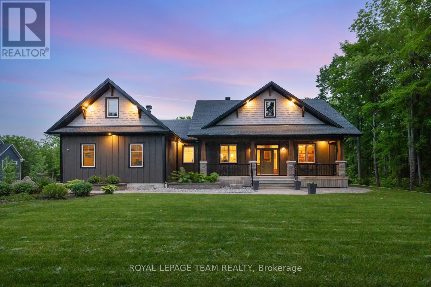 A truly one-of-a-kind luxury home where modern design meets natural serenity. This extraordinary 5-bedroom, 3-bathroom custom bungalow with loft offers high-quality living in one of Merrickville's most serene and private settings. Tucked away on a quiet court and backing onto a protected nature reserve, this 2.64-acre property is also feet from the Limerick Forest trailhead - a paradise for outdoor enthusiasts with direct access to hiking, biking, and ski trails. Designed and built with exceptional craftsmanship by Lockwood Brothers, the home features an open-concept layout, soaring ceilings with reclaimed wood beams, an impressive floor-to-ceiling gas fireplace that creates a striking focal point & cozy ambiance, and expansive windows that frame peaceful forest views. The chefs kitchen is outfitted with high-end appliances, custom cabinetry, and elegant finishes, perfect for entertaining or everyday comfort. A loft space offers room for a library, a home office, or retreat. Built on an energy-efficient Insulated Concrete Forms (ICF) foundation, the fully finished basement features large windows that let in lots of natural light, a rec room with a custom wood fireplace, and a versatile media room that, with its specialized venting system, has the ability (so far, unused) to double as a cigar lounge. Outside, enjoy a meticulously landscaped yard that complements the serene, natural setting, ideal for relaxation and entertaining. Additional peace of mind comes with a standby generator and advanced radon mitigation system, ensuring a safe, uninterrupted comfortable living environment year-round. Experience the perfect blend of elegance, comfort, and privacy in this one-of-a-kind retreat. Book your viewing today! (id:50982)