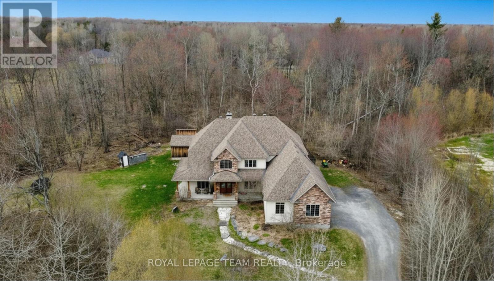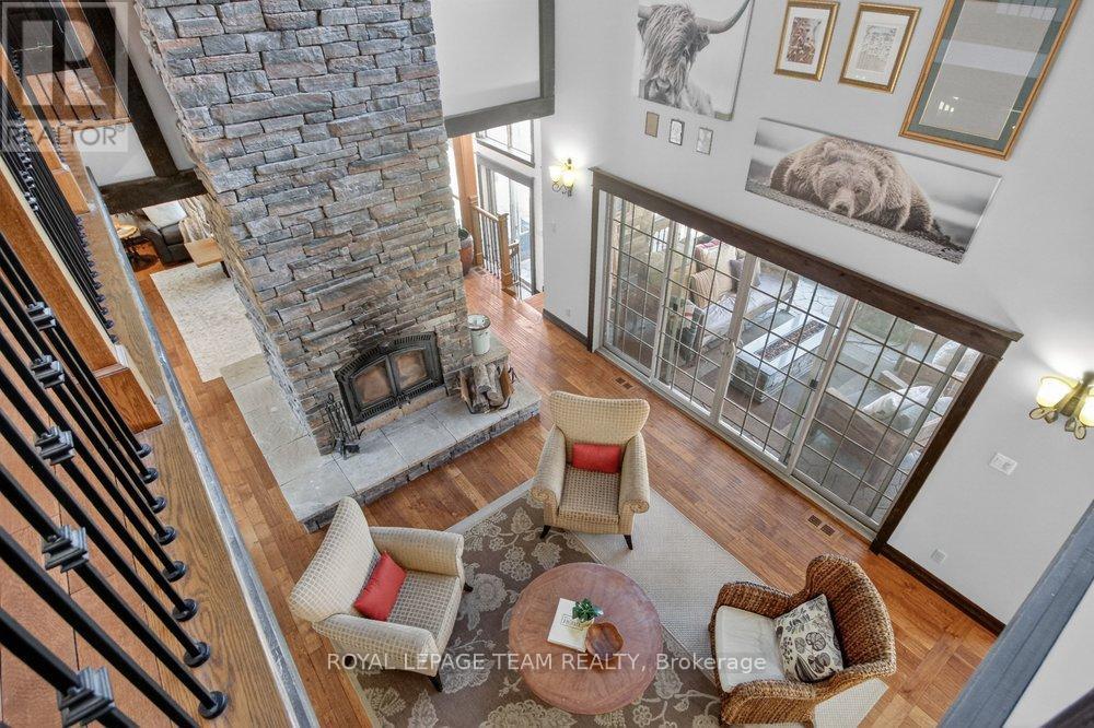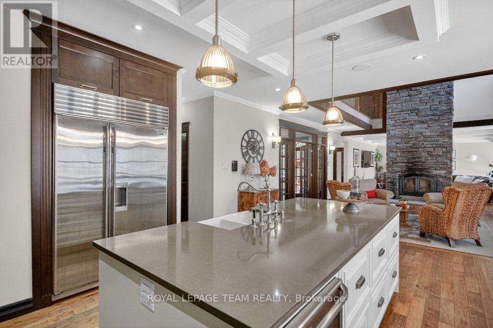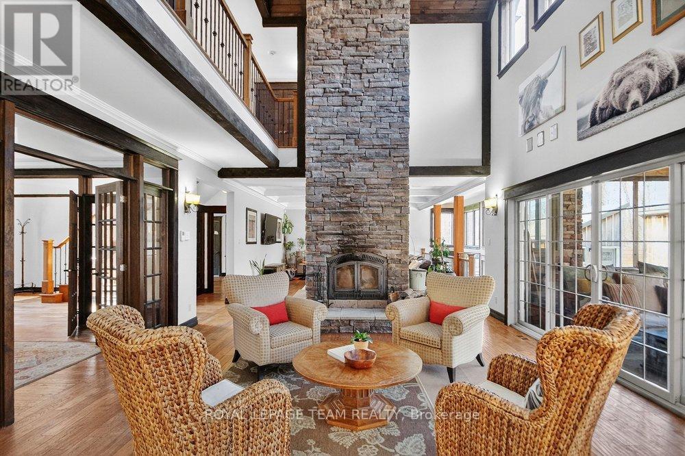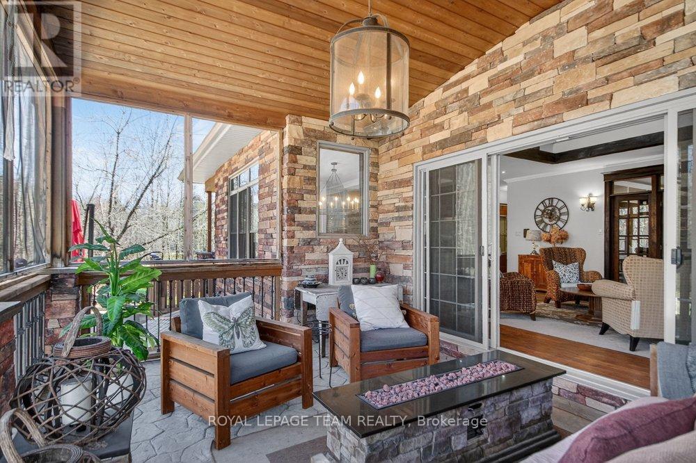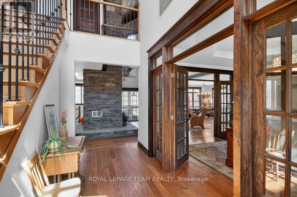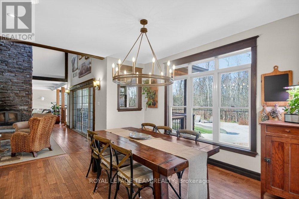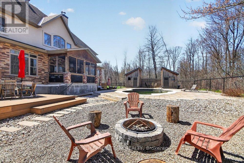 OPEN HOUSE NEXT SUNDAY MAY 3 2-4... BRING YOUR FAMILY...YOU WONT WANT TO LEAVE!!! Welcome to this stunning custom-built home in the heart of Greely, offering the perfect blend of luxury, warmth, & a charming Tremblant-inspired aesthetic. Nestled on a private, treed lot of over 2 acres, this exceptional property provides both tranquility and space, just minutes from city conveniences. Step inside to a grand foyer with soaring ceilings and an abundance of natural light, setting the tone for the craftsmanship and elegance found throughout. Beautiful hardwood floors flow seamlessly across the main and upper levels, enhancing the home's inviting atmosphere. The thoughtfully designed layout features a main floor bedroom complete with a 4-piece ensuite-ideal for guests or multi-generational living. Upstairs, you'll find three generously sized bedrooms, each with its own private ensuite, including a luxurious primary retreat boasting a spa-like ensuite with a standalone soaker tub. The gourmet kitchen is a chef's dream, featuring a built-in oven, quality finishes, and a layout perfect for entertaining. A striking double-sided stone fireplace creates a cozy ambiance between principal living spaces. The fully finished basement offers radiant heated floors throughout and includes a full bathroom, providing additional comfortable living space year-round. Step outside to your private backyard oasis featuring a beautiful in-ground pool and spacious patio-perfect for relaxing or hosting summer gatherings. This one-of-a-kind property combines rustic charm with modern luxury in a truly picturesque setting. The radiant heating in the lower level is serviced by a dual hot water tank - one for in floor radiant heat and one side for household use replaced in 2024. Pool and sheds installed 2022. Operating costs are wonderful for this size home. $225 for gas and $240 for hydro per month. (id:50982)