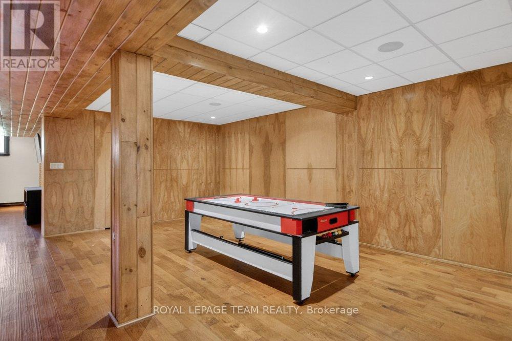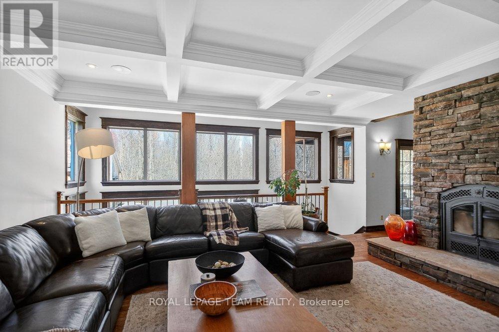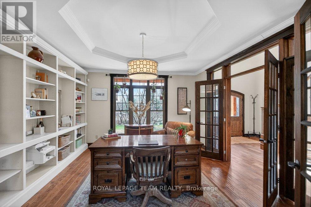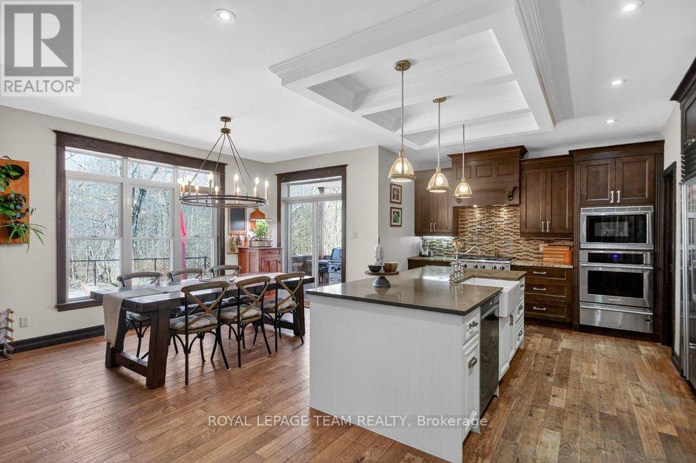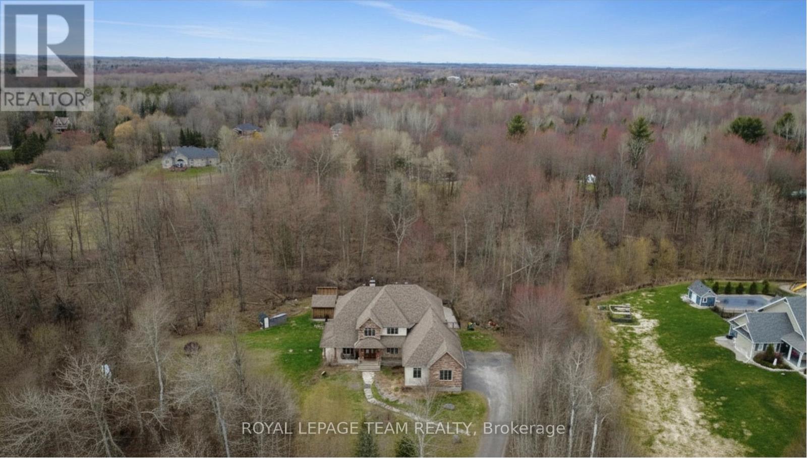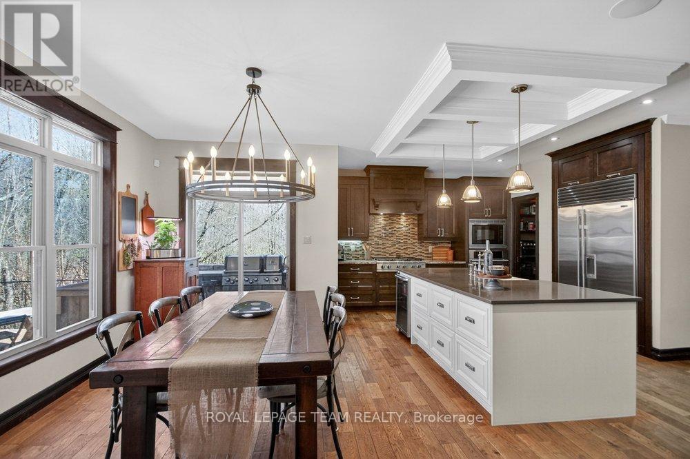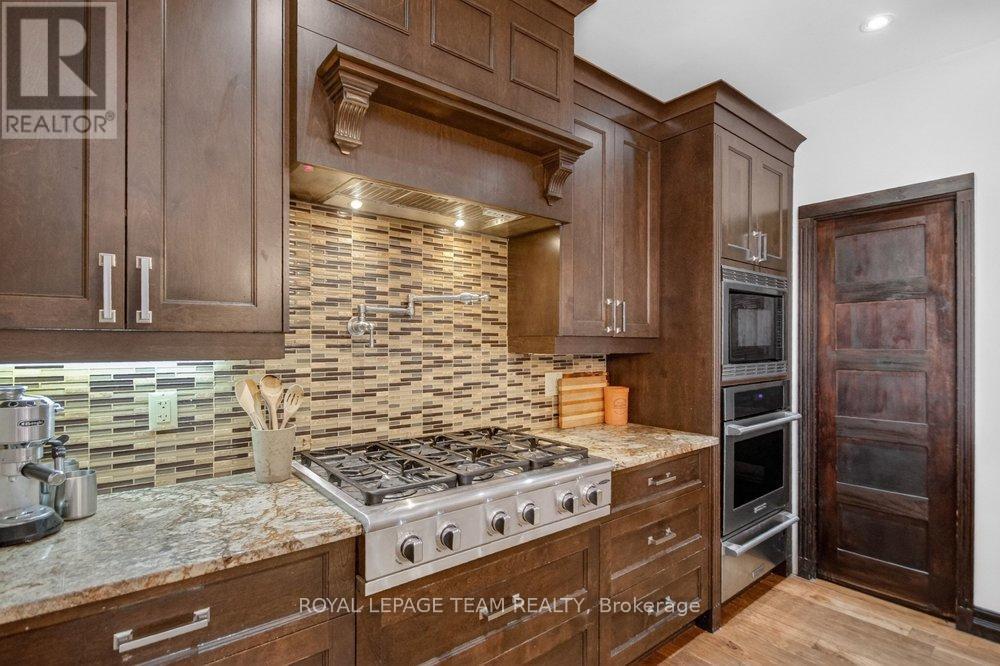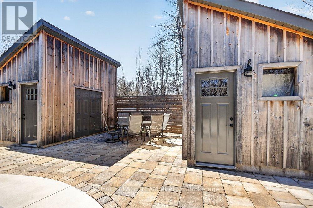 OPEN HOUSE NEXT SUNDAY MAY 3 2-4... BRING YOUR FAMILY...YOU WONT WANT TO LEAVE!!! Welcome to this stunning custom-built home in the heart of Greely, offering the perfect blend of luxury, warmth, & a charming Tremblant-inspired aesthetic. Nestled on a private, treed lot of over 2 acres, this exceptional property provides both tranquility and space, just minutes from city conveniences. Step inside to a grand foyer with soaring ceilings and an abundance of natural light, setting the tone for the craftsmanship and elegance found throughout. Beautiful hardwood floors flow seamlessly across the main and upper levels, enhancing the home's inviting atmosphere. The thoughtfully designed layout features a main floor bedroom complete with a 4-piece ensuite-ideal for guests or multi-generational living. Upstairs, you'll find three generously sized bedrooms, each with its own private ensuite, including a luxurious primary retreat boasting a spa-like ensuite with a standalone soaker tub. The gourmet kitchen is a chef's dream, featuring a built-in oven, quality finishes, and a layout perfect for entertaining. A striking double-sided stone fireplace creates a cozy ambiance between principal living spaces. The fully finished basement offers radiant heated floors throughout and includes a full bathroom, providing additional comfortable living space year-round. Step outside to your private backyard oasis featuring a beautiful in-ground pool and spacious patio-perfect for relaxing or hosting summer gatherings. This one-of-a-kind property combines rustic charm with modern luxury in a truly picturesque setting. The radiant heating in the lower level is serviced by a dual hot water tank - one for in floor radiant heat and one side for household use replaced in 2024. Pool and sheds installed 2022. Operating costs are wonderful for this size home. $225 for gas and $240 for hydro per month. (id:50982)