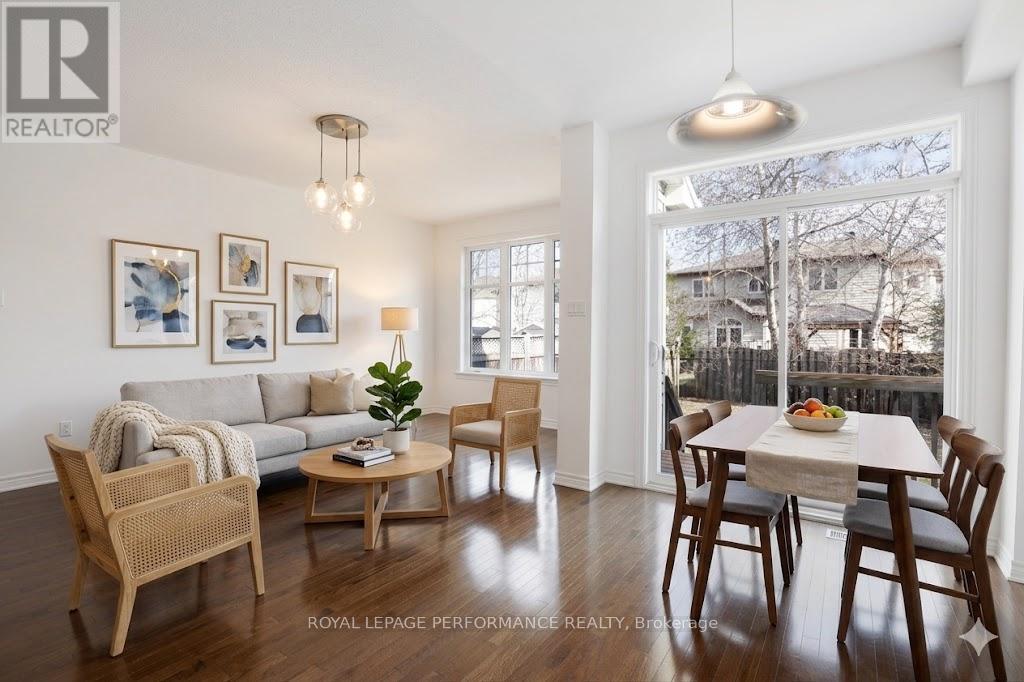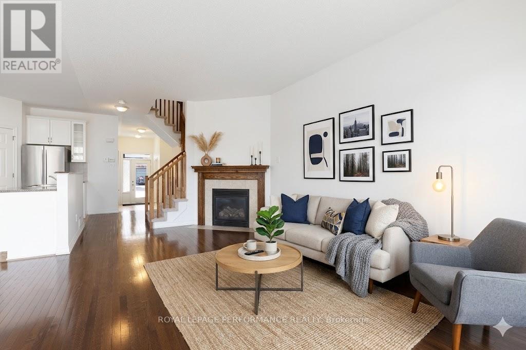 Welcome to this stunning, sun-drenched end-unit townhome perfectly situated in the highly sought-after community of Findlay Creek. Centre island in kitchen, stainless fridge, stove. Handy large corner pantry . The main level offers a sophisticated open-concept layout where natural light highlights the gorgeous, beaming hardwood flooring throughout the principal living spaces. The interior flows naturally to the outdoors through the dining room's patio doors, which lead directly to a private, fully fenced backyard. This home features three generous bedrooms, three well-appointed bathrooms, and the added benefit of a fully finished basement that significantly increases the total living area. Complete with an attached one-car garage and additional driveway parking, this property combines modern style with functional design in a prime location just minutes from local parks and amenities. Furnace 2019, Driveway 2022, Eaves troughing 2017. (id:50982)