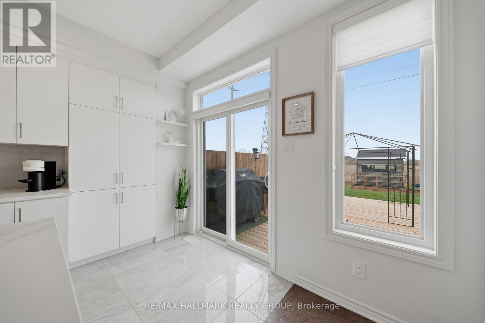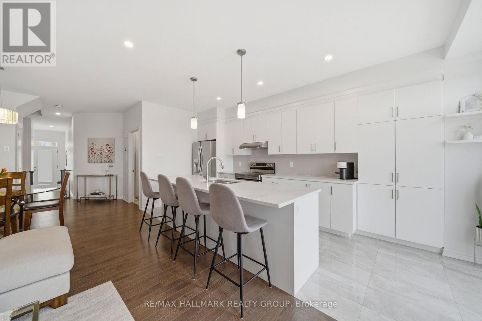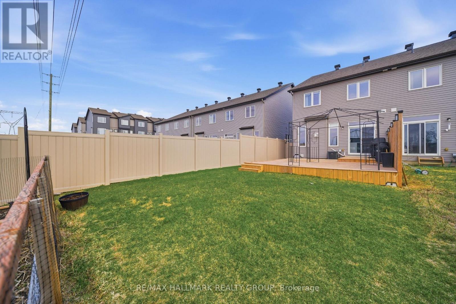 Upgraded 3 bedroom + finished basement end-unit townhome with no rear neighbours, oversized custom deck, and approximately 2,160 sq ft in one of Stittsville's most sought-after newer family communities. Built in 2020, this move-in ready home offers modern construction, premium finishes, and a rare amount of privacy for townhouse living. The main level features rich hardwood flooring, designer wall moulding details, gas fireplace, bright open-concept living, and a functional kitchen with extended cabinetry, pantry storage, and direct access to the backyard. Upstairs, hardwood continues throughout the hall and bedrooms, including a spacious primary retreat with walk-in closet and ensuite bath. The fully finished basement adds exceptional flexibility with a large rec room ideal for movie nights, home gym, office space, or playroom.Outside is where this property truly separates itself: no rear neighbours, open sightlines, a substantial custom-built deck, and added side-yard feel only an end unit can offer. Located near parks, walking paths, schools, recreation, and everyday shopping with quick access to Hazeldean, Terry Fox, and Highway 417. A rare combination of size, privacy, upgrades, and location. (id:50982)