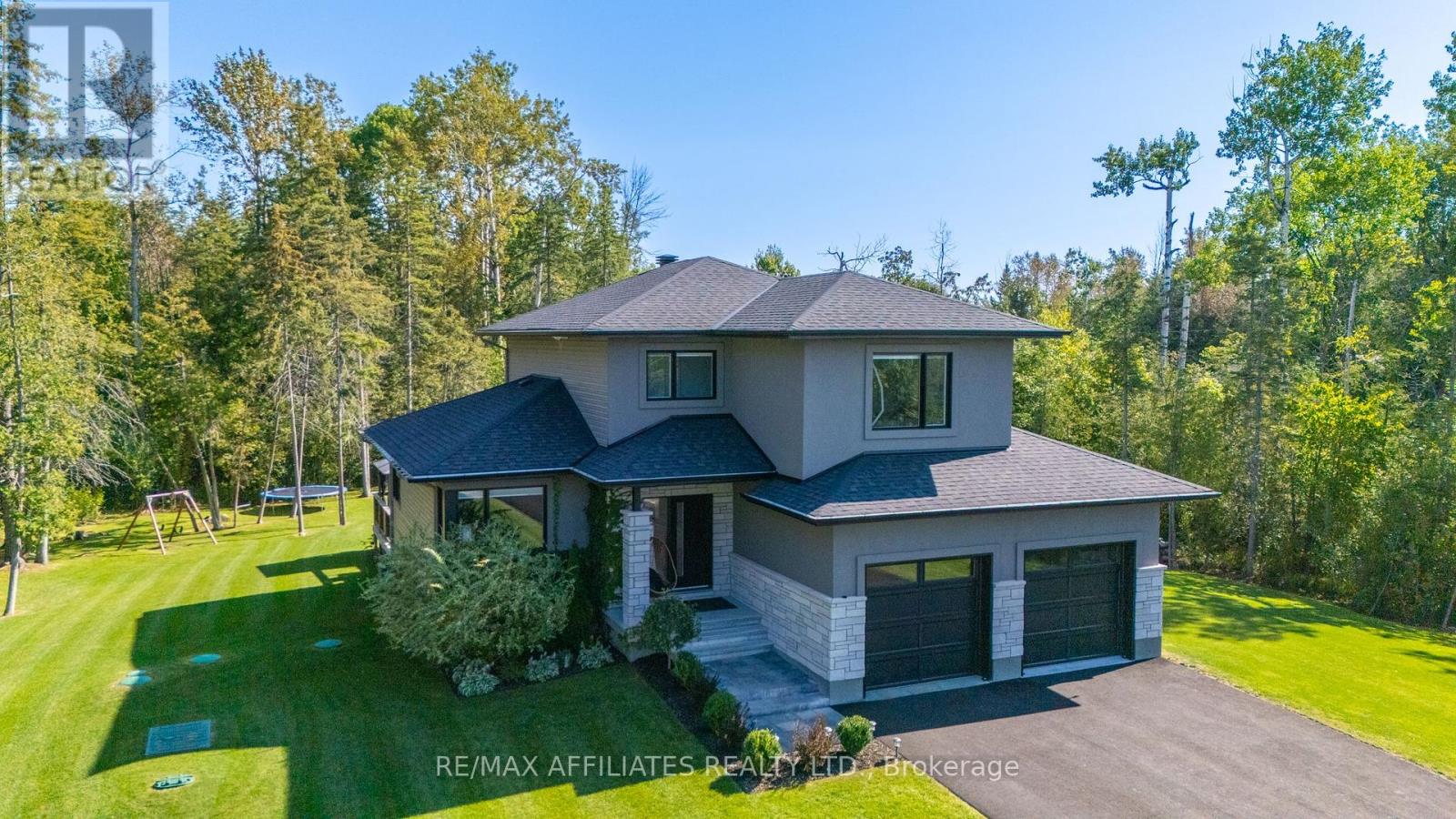 Nestled on a PRIVATE, TREED 1.13 ACRE Lot, this 2019 Tomar Home is a blend of modern luxury & peaceful country living. Long Paved Driveway leads to the Landscaped Yard w/IRRIGATION & Cozy Front Porch. Main Floor features Oak Hardwood, Modern Tile, 9FT Ceilings & a Spacious, Bright MAIN FLOOR DEN. The White Kitchen w/Bronze Handles is a chef's dream w/Lg Island w/Breakfast Bar, White Quartz Counters & Tile Backsplash, Pantry, SS Appliances including a Gas Stove w/Range Hood Fan. The Dining Area opens to a Lg, Private Deck w/Gazebo Surrounded by Mature Trees for Complete Privacy. The Spacious Living Rm has a Cozy Gas Fireplace w/Barn Board Mantle & Wood Shelves w/wall-to-wall windows. Convenient Mudroom off Garage (w/11' Ceilings) & Powder Bath w/Funky tile w/Black Accents. Hardwood Stairs & 2nd Level Landing lead to 3 Bedrooms & 2ND FL LAUNDRY. Primary Suite offers a WIC & 4PC Spa-Like Ensuite w/Hexagon Tile, Floating Double Vanity & Large Glass Shower. Modern Full Bath w/Lg Wood Vanity w/Quartz Counters & Hexagon 2 inch tiled floors & Modern White Subway in the Shower. Fully Fin Basement adds a Family Rm & 4th Bedroom w/Wide Plank Vinyl Floors, Lg Windows & Pot Lights + a Modern 3PC Bath w/Floating Vanity & Lg Glass Shower. Backyard is a PRIVATE OASIS! Features a Lg Deck, Gazebo w/Lights, Above Ground Pool, Firepit area, Surrounded by Mature Trees w/Plenty of room for the kids to play. Estate Neighbourhood on a Private Quiet, Corner Lot just 15 min to Kanata, 14 min to Almonte & 10 min to Carleton Place, it's the perfect location & is Move in Ready! 24HR IRREV on all offers. (id:50982)
