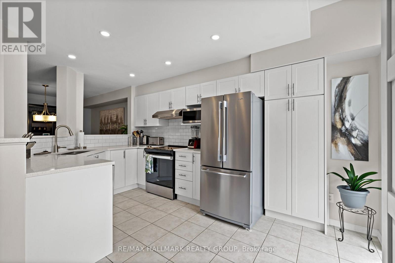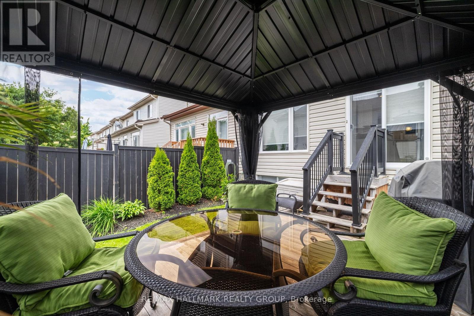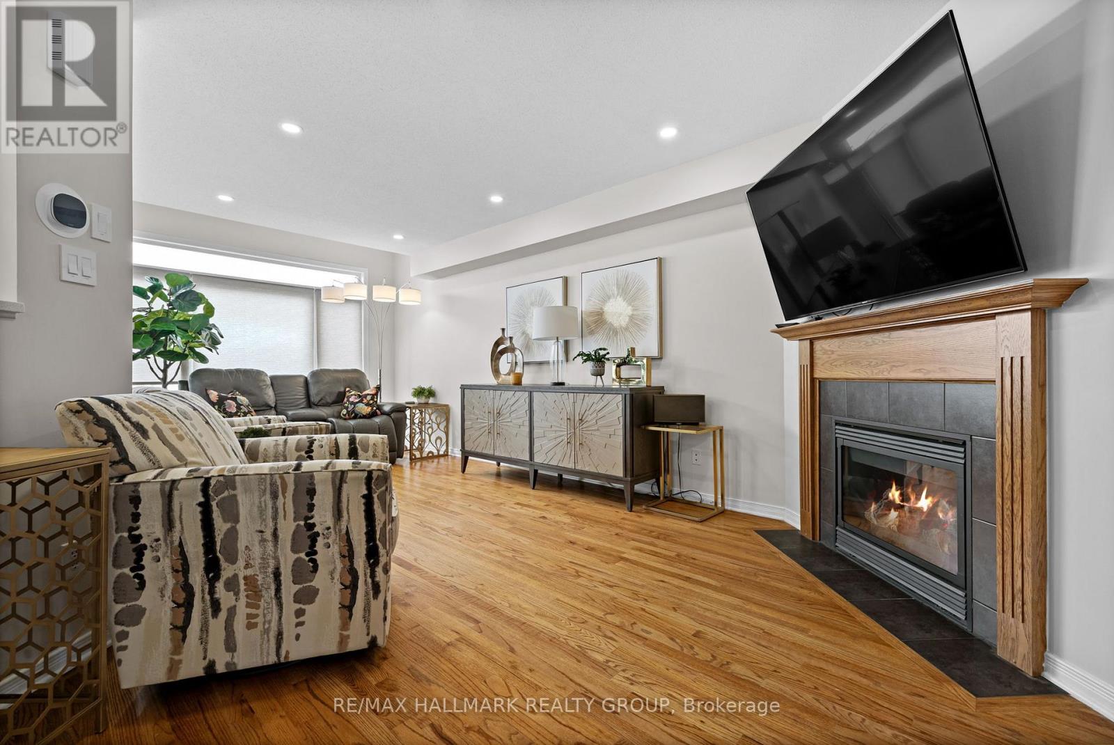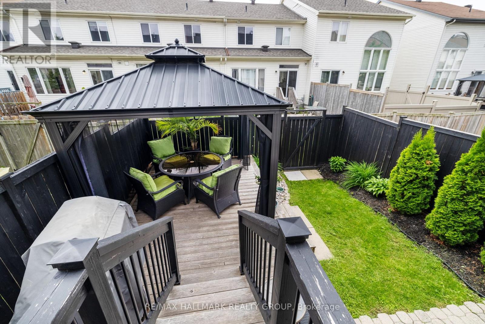 Beautifully maintained and spacious townhome in the sought-after community of Kanata South! This fully finished 3 bedroom, 2.5 bathroom home offers bright, open-concept living with thoughtful modern updates throughout. Step inside to a large and welcoming foyer that leads into the main level, where hardwood floors, pot lights, and oversized windows create a warm and inviting atmosphere filled with natural light. The updated kitchen features sleek quartz countertops, stainless steel appliances and refinished cabinetry. Enjoy ample counter space, cupboards and a pantry to meet all your family's everyday needs. The living room features a cozy gas fireplace, while the dining area provides space for family gatherings. Upstairs, you'll find three generously sized bedrooms, including a huge primary retreat complete with a walk-in closet, two additional wardrobes and a private ensuite bath with quartz countertops and a separate soaker tub. The stunning vaulted pine wood ceiling adds a unique and elegant touch to the space. Two additional bedrooms offer flexibility for family, guests or a home office, while a full bathroom and two linen closets complete the upper level. The fully finished lower level provides even more versatile living space, ideal for a home theatre, gym or potential additional bedroom. Also includes plenty of storage and a rough-in for a future 3-piece bathroom. Outside, the landscaped and fully fenced backyard is perfect for relaxing or entertaining. Enjoy summer days on the deck, complete with a gazebo and privacy screens ideal for BBQs and hosting family and friends. approx. 2,000 sqft of living space. Ideally located close to parks, schools, shopping, restaurants, groceries, and public transit. Turnkey living in a family-friendly neighbourhood. Lots of updates! See feature sheet attached. Furnace 2025, A/C 2024, Humidifier 2024, Roof Shingles 2022. 24-hour irrevocable on all offers, Schedule B & Disclosure of interest to be included with offers. (id:50982)