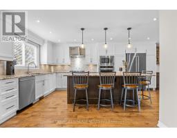 This beautifully updated two-storey home showcases exceptional pride of ownership throughout and features a stunning professionally remodelled main level designed for modern living. Nestled on a quiet crescent in one of Ottawa's most desirable west-end communities, this move-in ready property offers a private backyard with no rear neighbours and impressive curb appeal.The heart of the home is the high-end chef's kitchen, complete with a large centre island, extended cabinetry, granite countertops, and premium appliances throughout, including a built-in wall oven, gas cooktop, and wine chiller fridge. Thoughtfully designed for both everyday living and entertaining, the main level also offers elegant remodeled open concept living and dining rooms, a warm and inviting family room with natural gas fireplace, convenient main floor laundry, hardwood flooring throughout, and a redesigned staircase that adds a refined custom touch. A built-in china cabinet and buffet with quartz counters provide both style and functionality. Upstairs, you'll find generously sized bedrooms and beautifully renovated bathrooms, including a luxurious primary ensuite featuring a spacious walk-in rainfall shower and double quartz sinks. The additional main bathroom has also been tastefully updated with quality finishes. The finished lower level adds valuable extra living space, perfect for a recreation room, home gym, or office. Outside, enjoy the newer patio, interlock surround walkway extending from the driveway to the backyard, and a peaceful private setting with no rear neighbours. A rare offering that combines quality upgrades, timeless style, and true pride of ownership-this is a home that shows exceptionally well and is sure to impress. (id:50982)