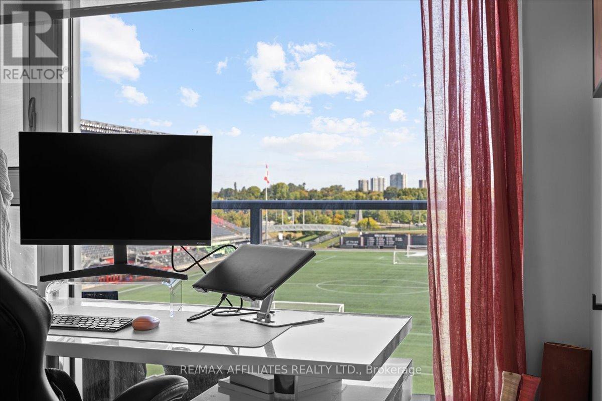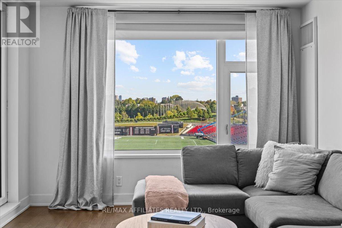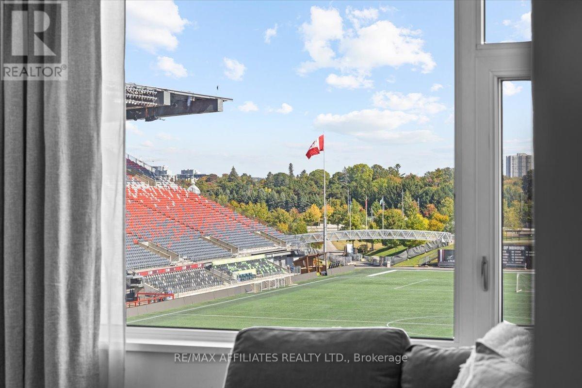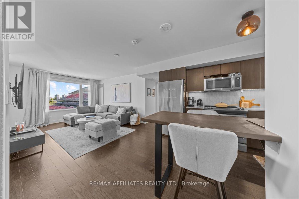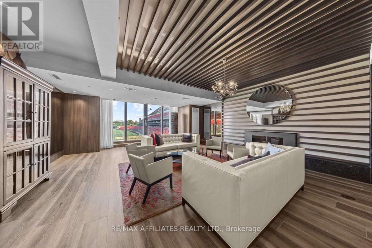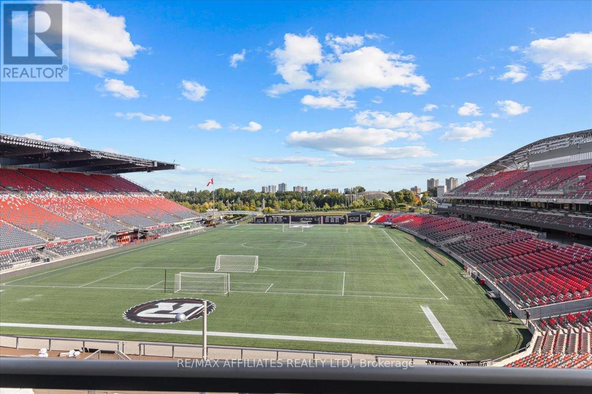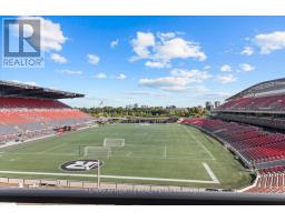 Lansdownes luxury condominium lifestyle, in the heart of The Glebe, secure front lobby entrance w/marble tile, luxury finishes, waterfall features & concierge service, beautiful two-bedroom, two-full bathroom w/eastern morning exposure & field side views enjoyed from your private covered balcony, inside you will find modern touches throughout w/engineered wide plank hardwood, flat ceilings, high-profile baseboards & thoughtful design details, bistro-style kitchen is both stylish & functional, featuring quartz counter tops, island w/seating, European cabinetry, valence lighting, 3/4 split sink framed by vertical tile backsplash, living room w/wall of windows & passage door to balcony, both bedrooms provide serene views of the field, primary bedroom suite w/multiple PAX closets & a spa-inspired 4 pc ensuite boasting twin sinks, quartz vanities, oversized walk-in shower & elegant finishes, exceptional amenities include a rooftop lounge & terrace overlooking the Canal w/BBQ station, a state-of-the-art fitness centre, guest suites & field side entertainment spaces designed for gathering & take in the game experience w/friends & family, private owned locker & secure underground parking w/direct underground access to shops, restaurants, theatres, Whole Foods & LCBO w/outdoor access to Ottawas best including the Rideau Canal, bike paths, skating, cafés, restaurants, patios & seasonal festivals, 24 hour irrevocable on all offers. (id:50982)