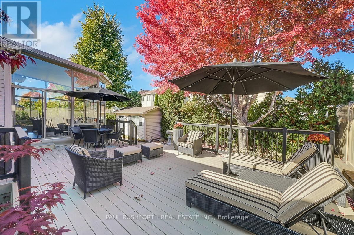 Absolutely STUNNING 3+2 bedroom bungalow in Granite Ridge, renovated from top to bottom with exceptional attention to detail. Every space has been thoughtfully finished to the highest standard, blending comfort, style, and everyday ease. From the moment you arrive at the driveway, front walkway (2019), and porch, you'll be greeted by a sense of sophistication and warmth. Combined with newer front and garage doors, an upgraded irrigation system, and a 50-year roof, this home reflects meticulous care and thoughtful upgrades. Inside, 9' ceilings, oversized windows, and contemporary shutters fill the main floor with natural light. The layout flows beautifully between the great room, elegant dining room, and private office(bedroom #3): perfect for working from home. The kitchen (2018) is truly the heart of the home: quartzite counters, professional grade stainless steel appliances, full-height custom cabinetry, valence lighting, and French doors opening to a sun-drenched solarium (2019). An absolutely magical place to spend time with the people you love most. The fully fenced PVC yard extends your living space outdoors with a custom deck, flagstone walkway, and shed (w/power): ideal for quiet mornings or summer entertaining. The primary suite is a peaceful retreat featuring a walk-in closet and a luxurious ensuite with Calacatta marble shower, heated floors, and quartz counters. All bathrooms throughout the home have been beautifully updated with timeless finishes. The lower level continues the quality with a spacious rec room, gym area, second laundry, 2 bedrooms (one w/custom WIC) and a full glorious bath. Designed for easy, refined living, this home offers the rare combination of luxury and comfort. Impeccably maintained, move-in ready, and located in one of Stittsville's most desirable neighbourhoods. Furnace (2020), A/C (2020), Roof (2019). One of a kind, truly remarkable...A MUST SEE! (id:50982)