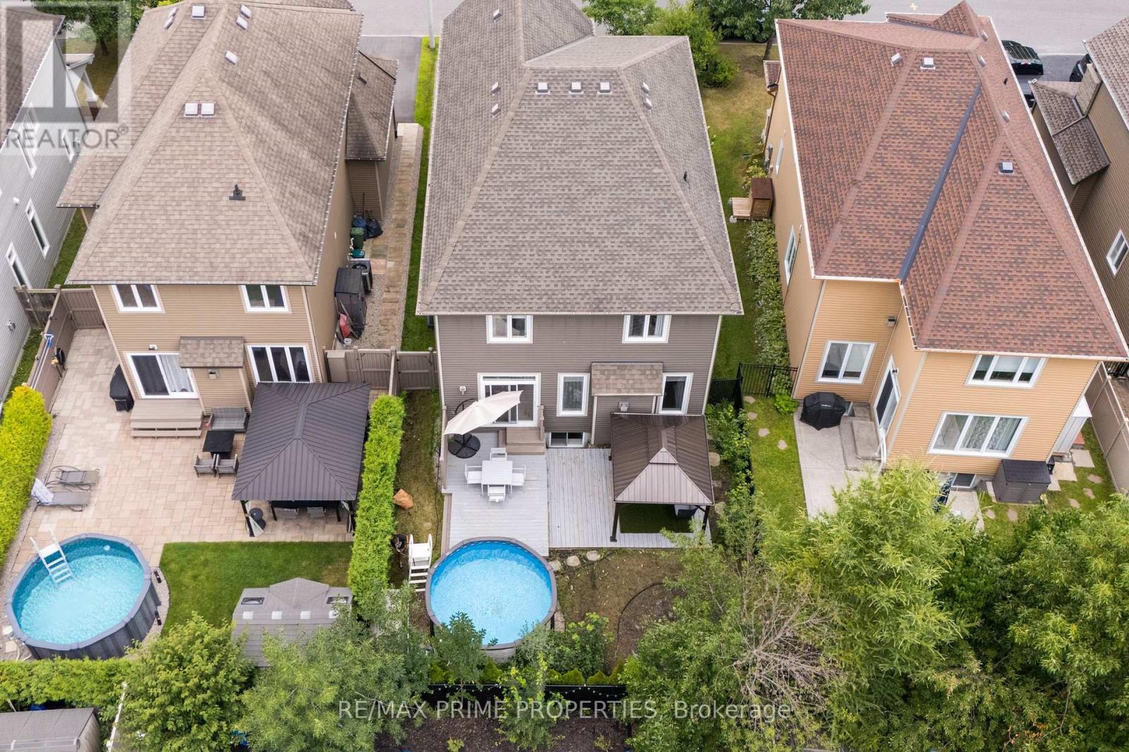 Welcome to this absolutely stunning 4-bedroom, 4-bath home in a family-friendly neighbourhood close to parks, schools, and more! Featuring 9ft ceilings, hardwood, ceramic tile, and warm, inviting tones throughout. The main floor includes a quiet den perfect for a home office and a formal dining room with vaulted ceilings adjacent to the gourmet kitchen with rich cabinetry, granite countertops, and a spacious eat-in area overlooking the family room with gas fireplace. Enjoy the private, fully fenced backyard with a heated saltwater above-ground pool and two-tiered deck ideal for entertaining. Upstairs offers hardwood floors, a luxurious primary retreat with a large walk-in closet and spa-like 4-piece ensuite, plus 3 additional bedrooms, a full bath, and convenient laundry. The finished basement includes a large rec room with gas fireplace, full bath, gym area, and ample storage. (id:50982)