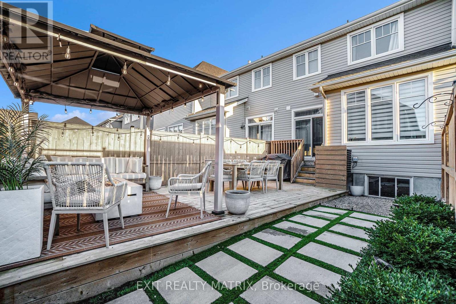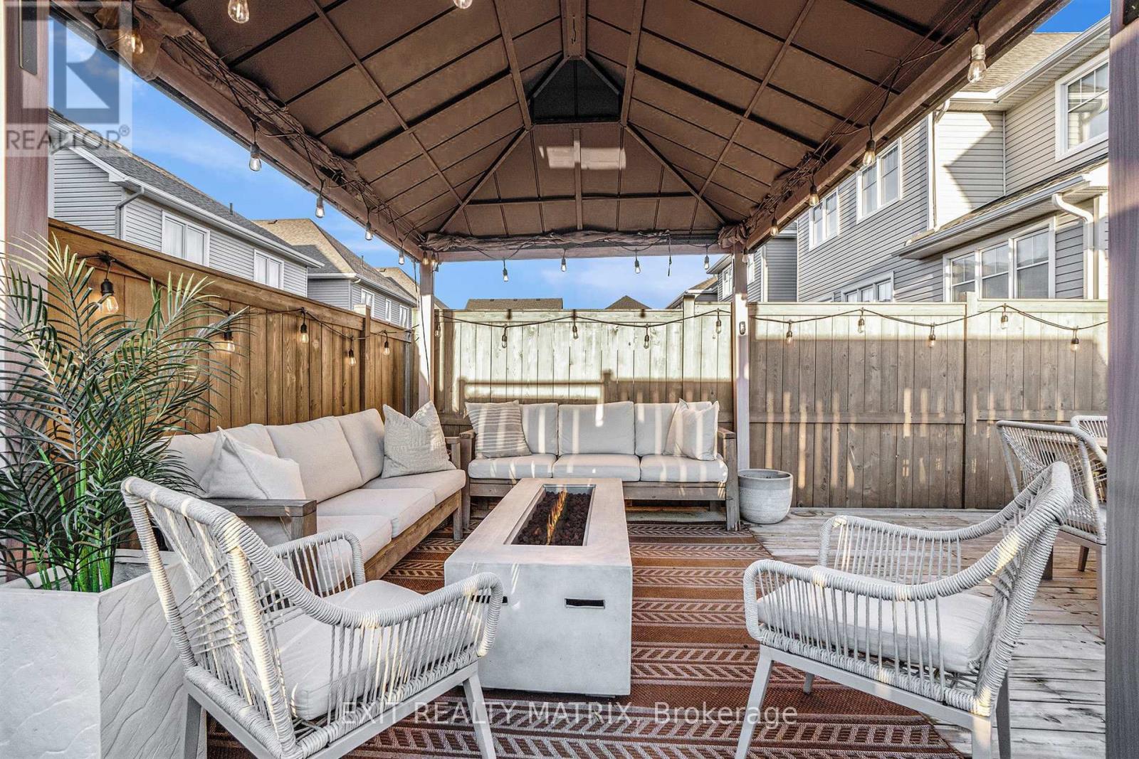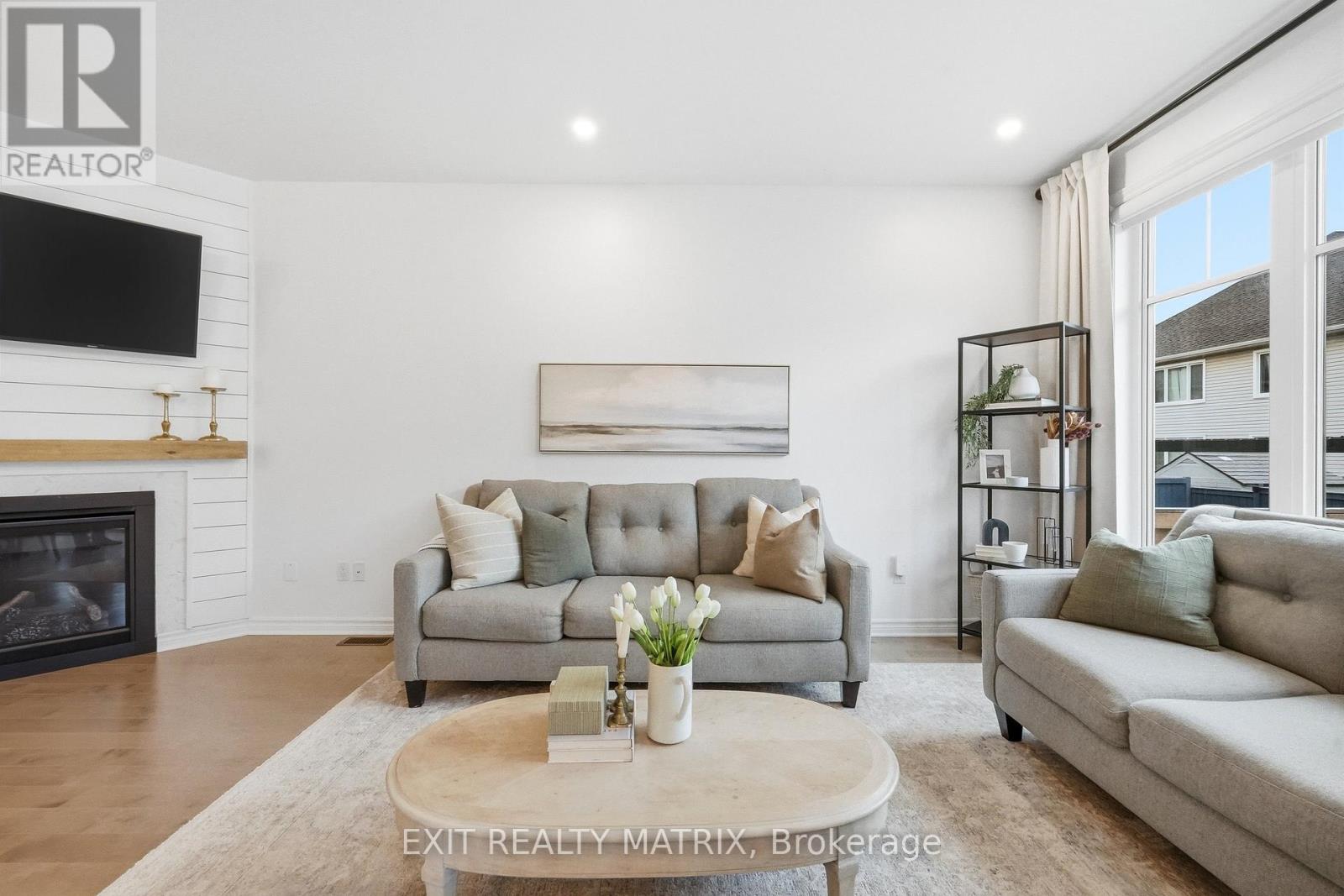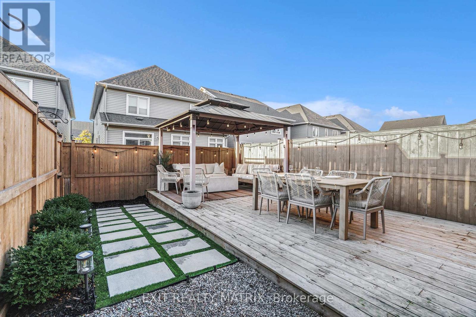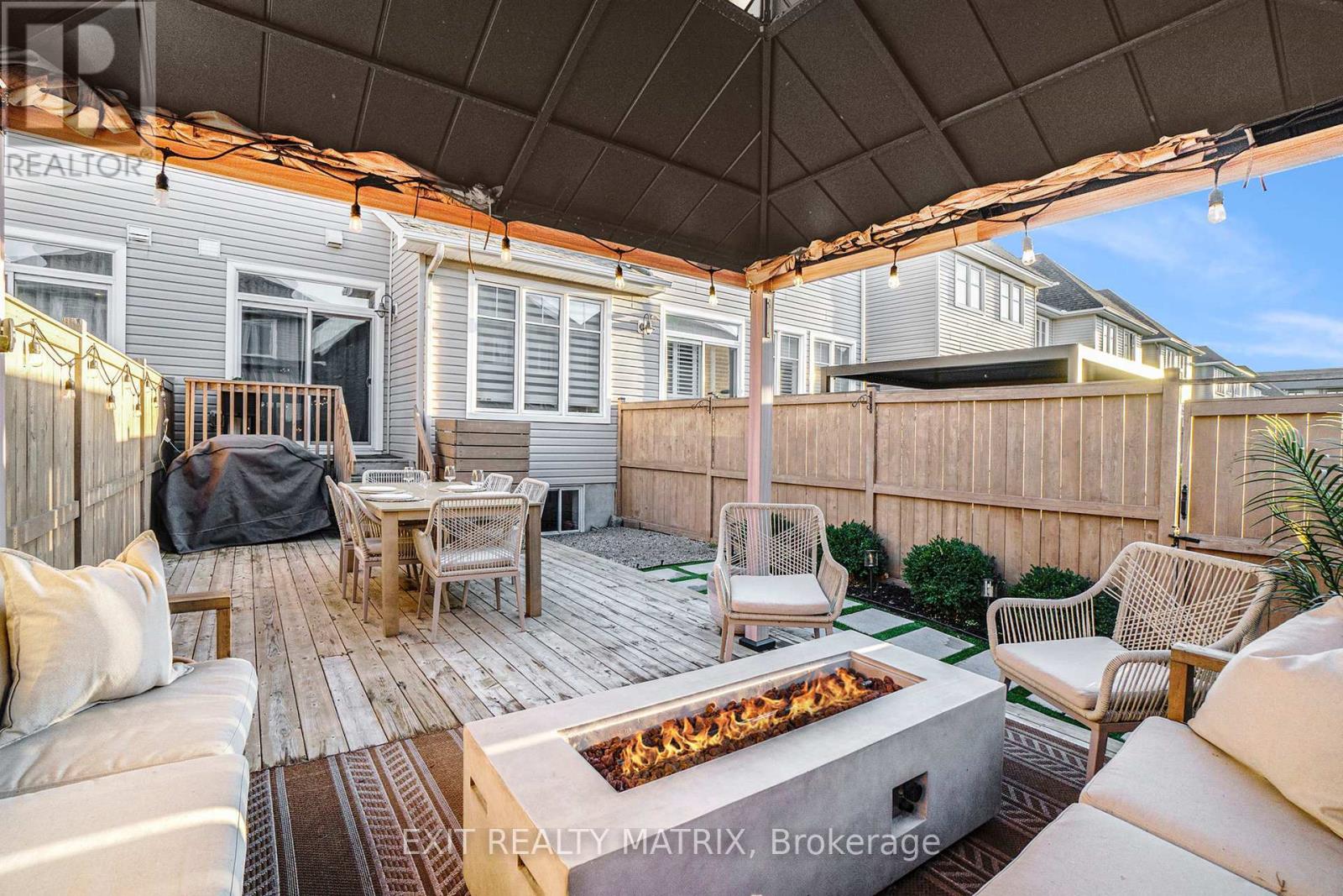 Welcome to this beautifully finished 3-bedroom home, thoughtfully elevated with refined upgrades and tasteful, designer-inspired finishes throughout. Step onto the inviting front porch and into a bright, welcoming entrance featuring a beautiful accent wall and a convenient powder room bath. The main floor impresses with carefully selected upgrades and stylish finishes, including a stunning kitchen complete with island, pantry, stainless steel appliances, and wooden floating shelves. The dining area features a custom accent wall, while the sun-filled living room offers a cozy gas fireplace with shiplap surround is perfect for everyday living and entertaining. Patio doors lead to a deck overlooking the fully fenced backyard, complete with a gazebo - perfect for relaxing or entertaining. Upstairs, the spacious primary bedroom is a true highlight, featuring elegant board and batten detailing, upgraded vinyl flooring, and a luxurious 5-piece ensuite with a soaker tub, double sinks, and a glass-enclosed shower. A walk-in closet with custom-built-in organization adds both style and practicality. Two additional bedrooms, a full bathroom with quartz counters, and a convenient second-level laundry room with extra storage complete this level. The finished lower level continues the home's elevated feel with a gas fireplace and custom built-in shelving-perfect for a cozy family room, media space, or home office. A thoughtfully designed home offering a warm, inviting feel throughout, this home offers a move-in ready opportunity. Located in the desirable Half Moon Bay area, enjoy easy access to nearby green spaces including Half Moon Bay Park and Cambrian Park, offering playgrounds, walking trails, and open spaces for recreation year-round. Just a short drive to the Barrhaven Town Centre, where you'll find shopping, dining, grocery stores, and everyday essentials all in one place. (id:50982)