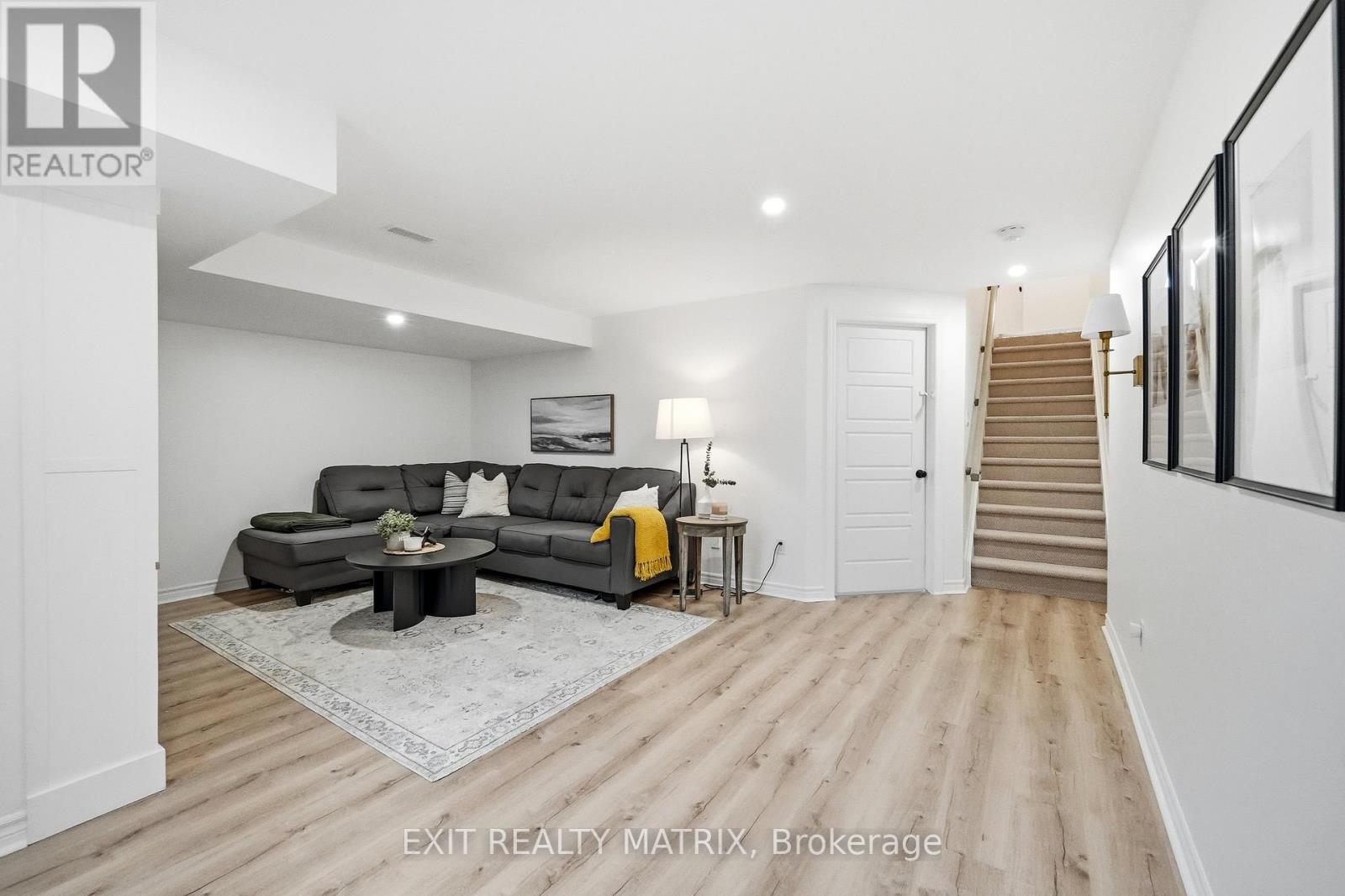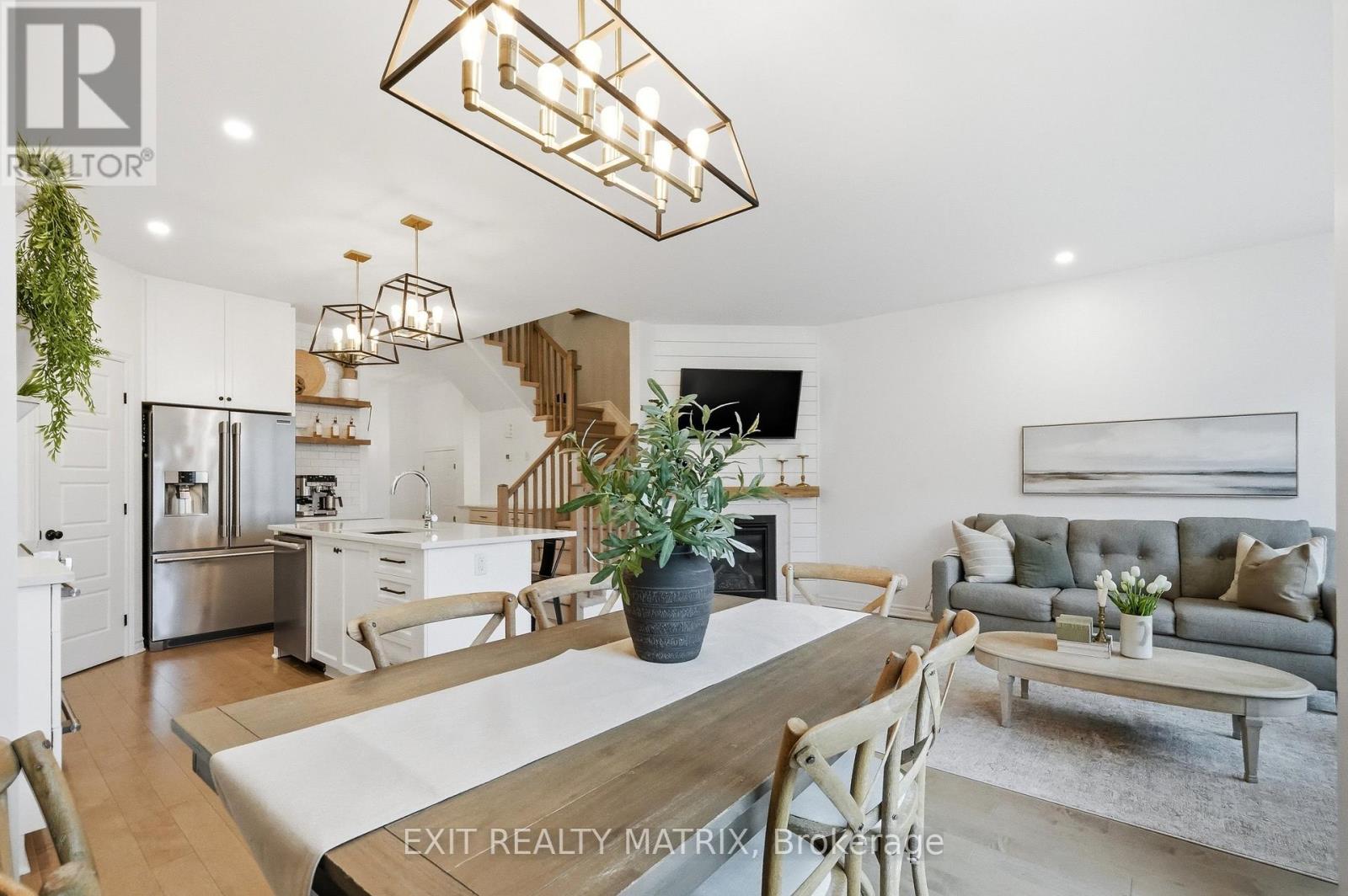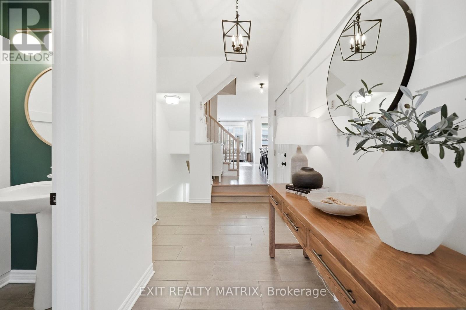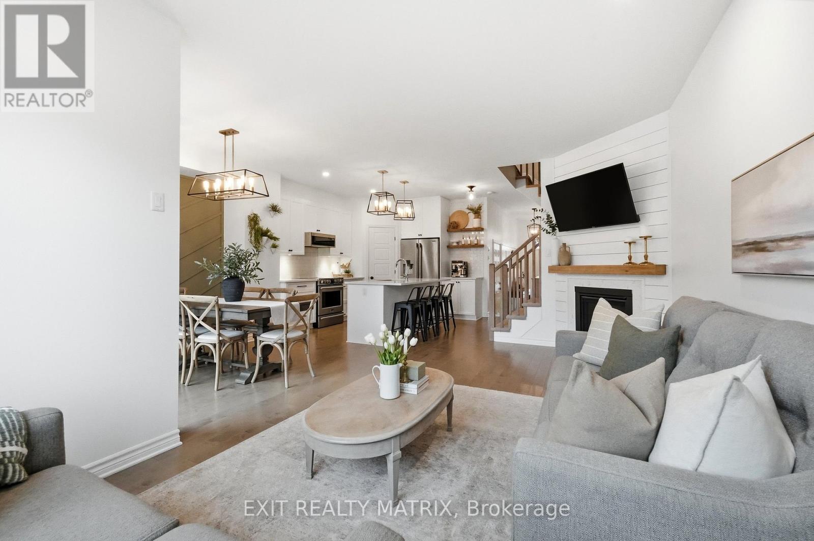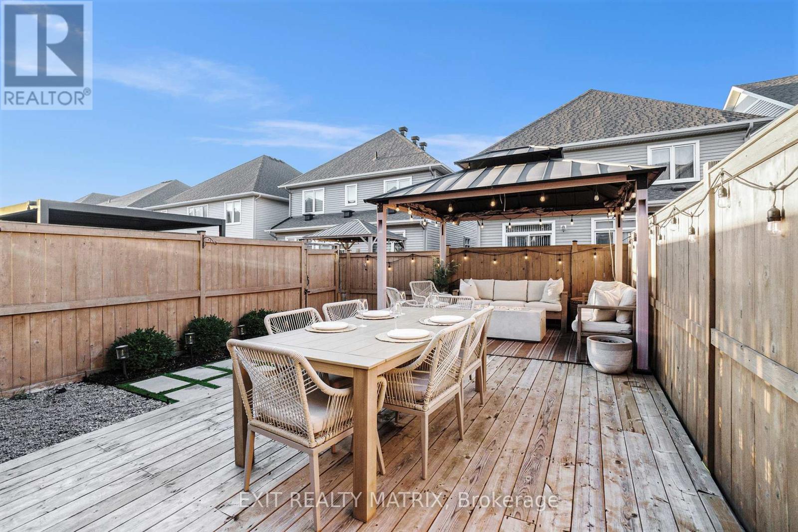 Welcome to this beautifully finished 3-bedroom home, thoughtfully elevated with refined upgrades and tasteful, designer-inspired finishes throughout. Step onto the inviting front porch and into a bright, welcoming entrance featuring a beautiful accent wall and a convenient powder room bath. The main floor impresses with carefully selected upgrades and stylish finishes, including a stunning kitchen complete with island, pantry, stainless steel appliances, and wooden floating shelves. The dining area features a custom accent wall, while the sun-filled living room offers a cozy gas fireplace with shiplap surround is perfect for everyday living and entertaining. Patio doors lead to a deck overlooking the fully fenced backyard, complete with a gazebo - perfect for relaxing or entertaining. Upstairs, the spacious primary bedroom is a true highlight, featuring elegant board and batten detailing, upgraded vinyl flooring, and a luxurious 5-piece ensuite with a soaker tub, double sinks, and a glass-enclosed shower. A walk-in closet with custom-built-in organization adds both style and practicality. Two additional bedrooms, a full bathroom with quartz counters, and a convenient second-level laundry room with extra storage complete this level. The finished lower level continues the home's elevated feel with a gas fireplace and custom built-in shelving-perfect for a cozy family room, media space, or home office. A thoughtfully designed home offering a warm, inviting feel throughout, this home offers a move-in ready opportunity. Located in the desirable Half Moon Bay area, enjoy easy access to nearby green spaces including Half Moon Bay Park and Cambrian Park, offering playgrounds, walking trails, and open spaces for recreation year-round. Just a short drive to the Barrhaven Town Centre, where you'll find shopping, dining, grocery stores, and everyday essentials all in one place. (id:50982)