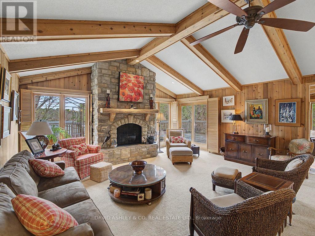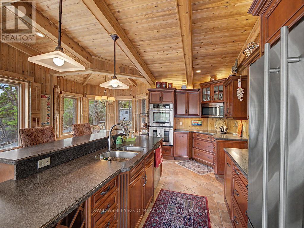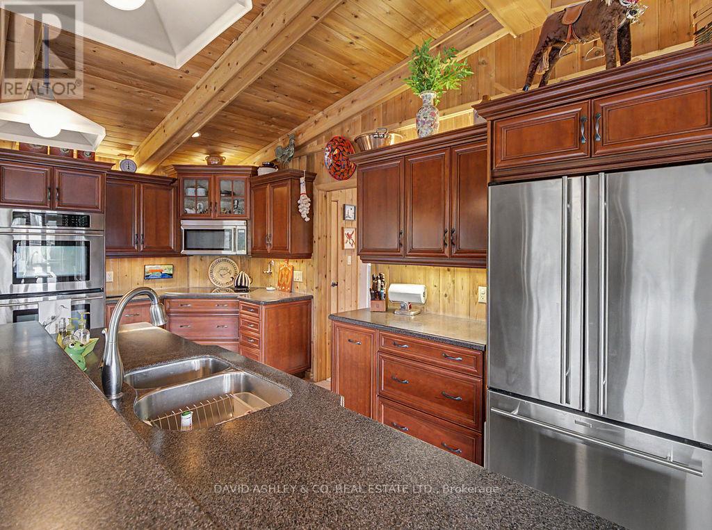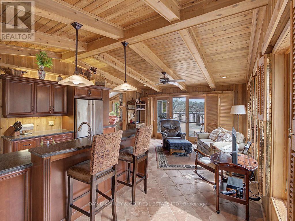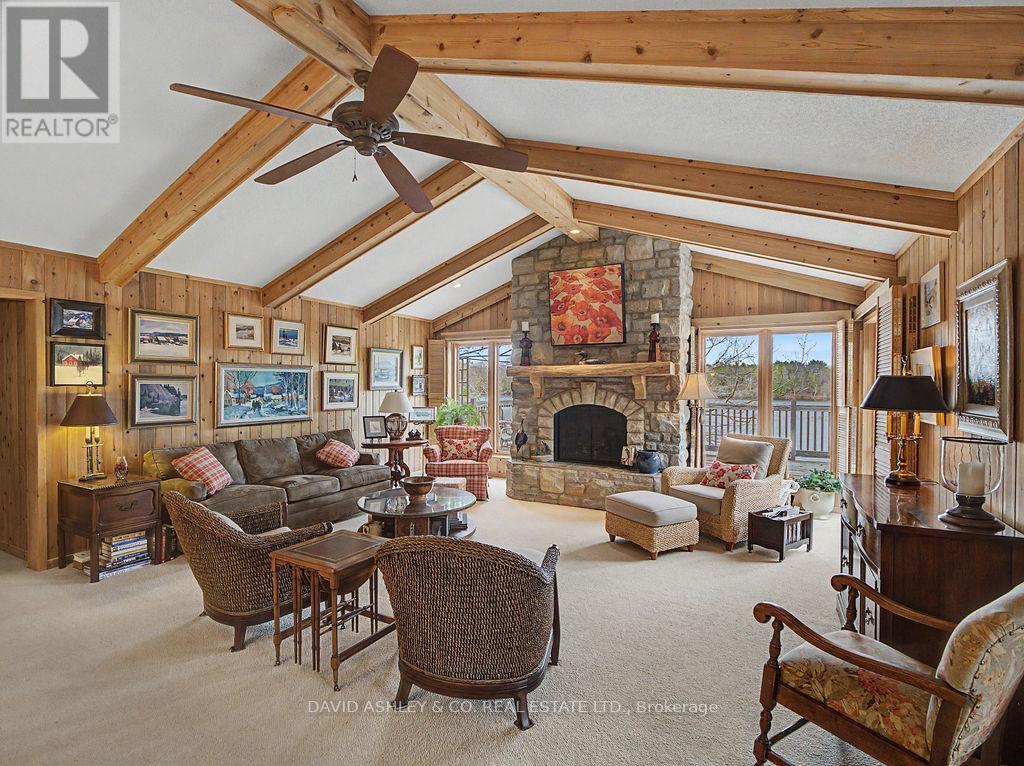 Welcome to 941 Jones Falls Road ...A Spectacular Private Waterfront Oasis located on a huge Treed lot on Sand Lake next to Jones Falls locks. A short distance from the historic 1831 Great Stone Arch Dam. This newly (2006) built raised bungalow boasts 3 +1 bedrooms with optional family room and 2 full bathrooms. Enjoy the 270 degree view of your very own 510 ft of waterfront nestled amongst mature trees on a tranquil private point. This maintenace free Stone clad home with Open Concept living boasts a floor to ceiling stone propane Fireplace in the Great room as well as a second gas fireplace in the lower level family room. The cathedral ceilings with custom woodwork and trim throughout create a quaint cottage feel with all the modern amenities of today's upscale living. A massive 60 ft deck with portable gazebo extends the entire lakeside front of this home with numerous access points off the primary bedroom, great room and kitchen. Enjoy deep crystal clear water for swimming, boating and fishing. The custom stairs from your private dock allows for safe easy access to and from the water. The landscaping is truly picturesque with a handy watering system pulling water from the lake for watering the numerous gardens. When the flowers are in full bloom the scenic gardens are right out of a magazine. The oversized double car garage allows for 3 large vehicles or storage for your water toys. The entertaining Gourmet Kitchen with custom cabinetry and pull out drawers is an absolute dream for the aspiring chef. A cozy octagonal kitchen breakfast nook surrounded in floor to ceiling windows is a favorite place to enjoy a peaceful morning coffee. One of the main features of this home are the oversized windows...every room comes with an unforgetable view of nature at its finest...floor to ceiling windows allow an abundance of natural light throughout this home all day long. This home is a Must See for the discriminating waterfront enthusiast...book your private viewing today (id:50982)