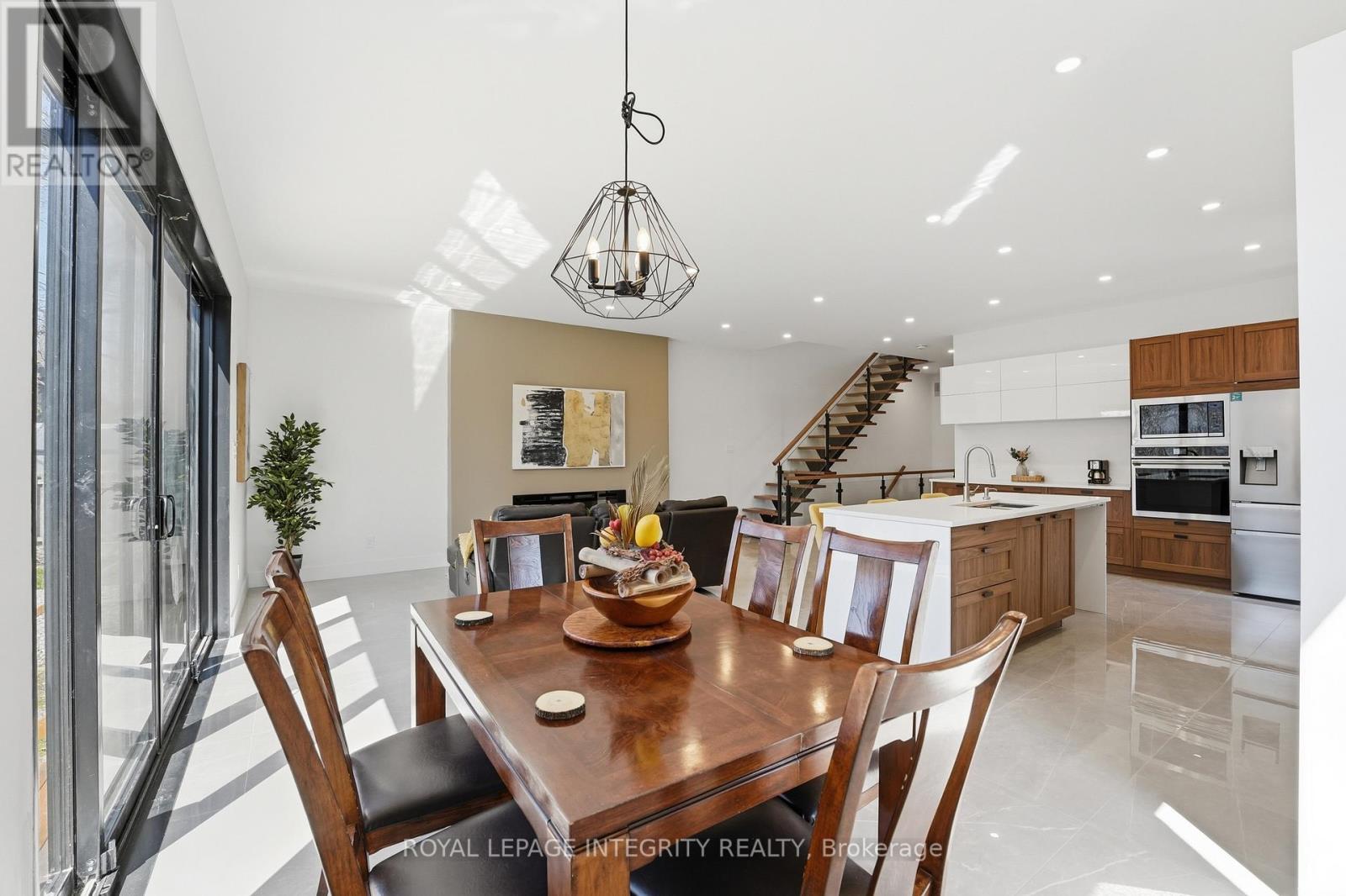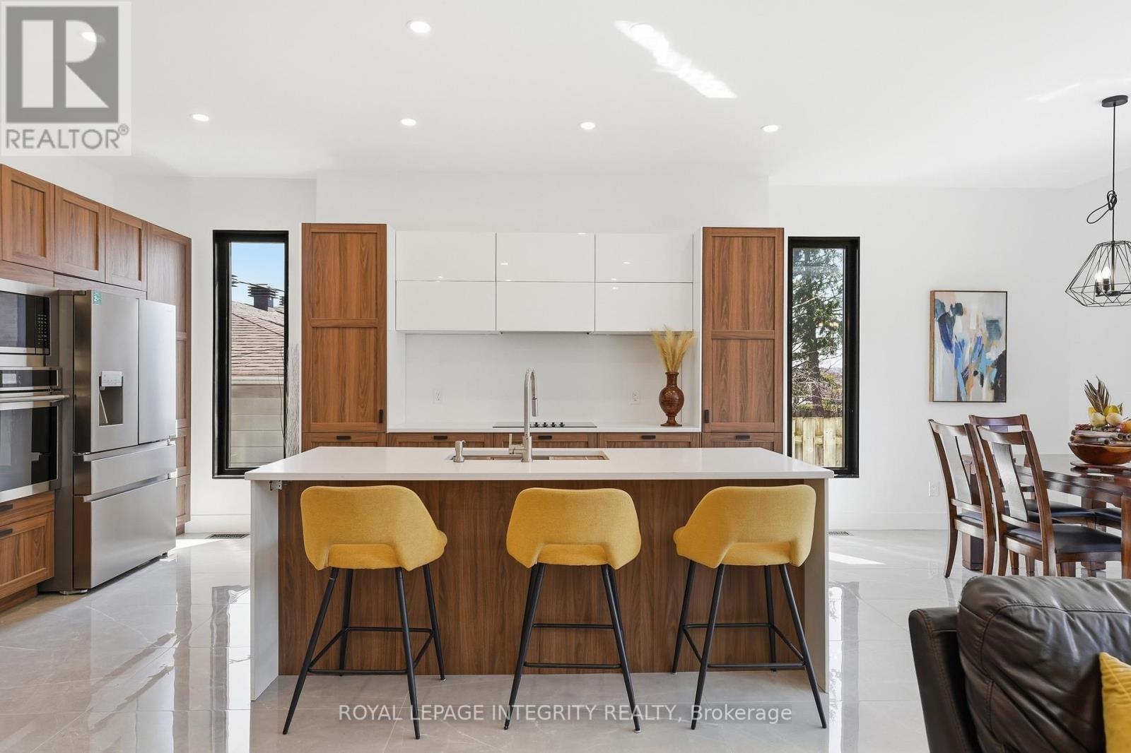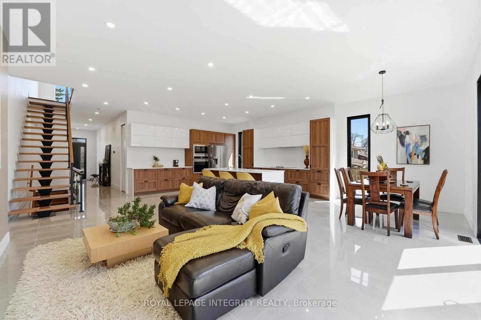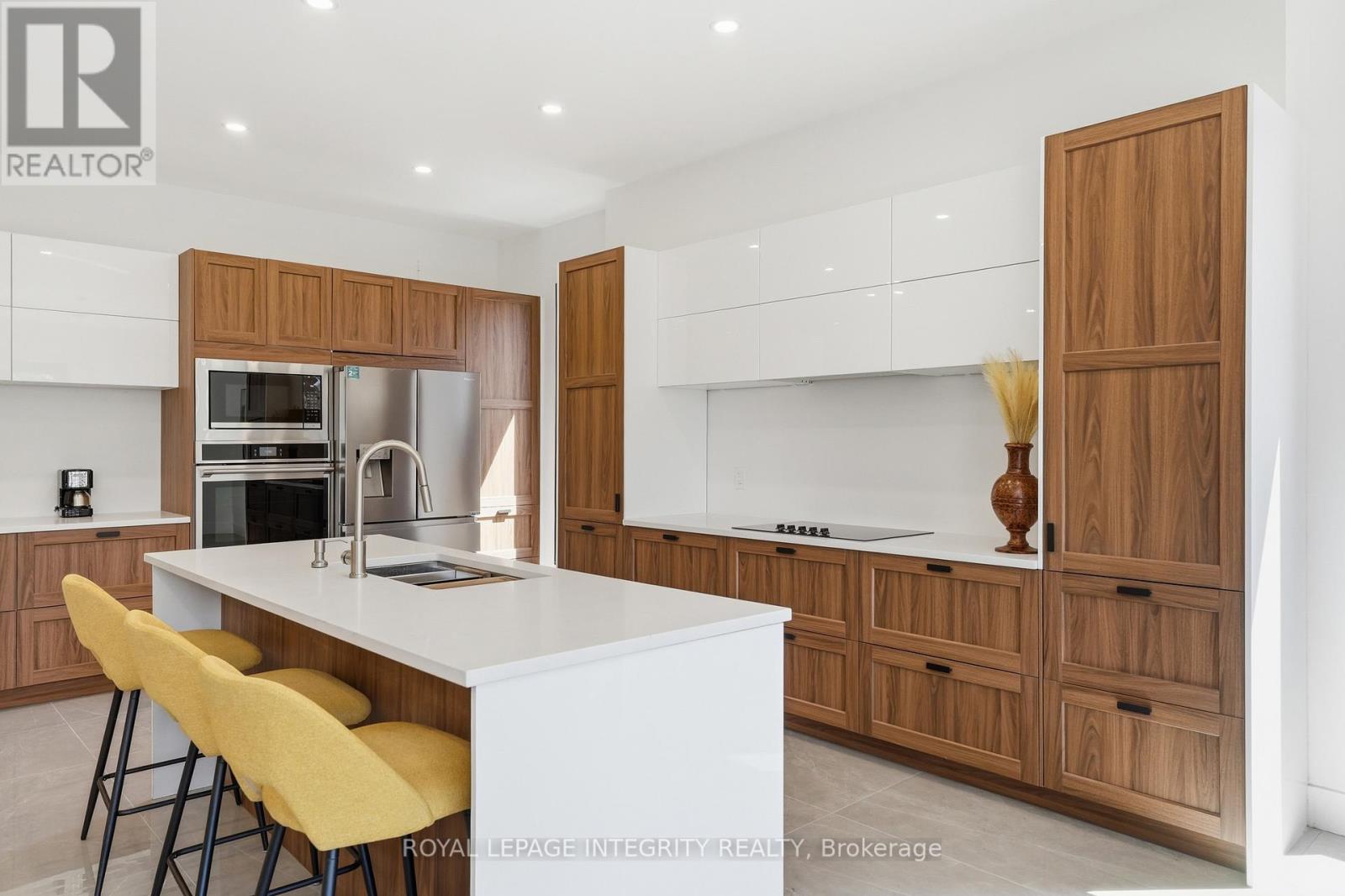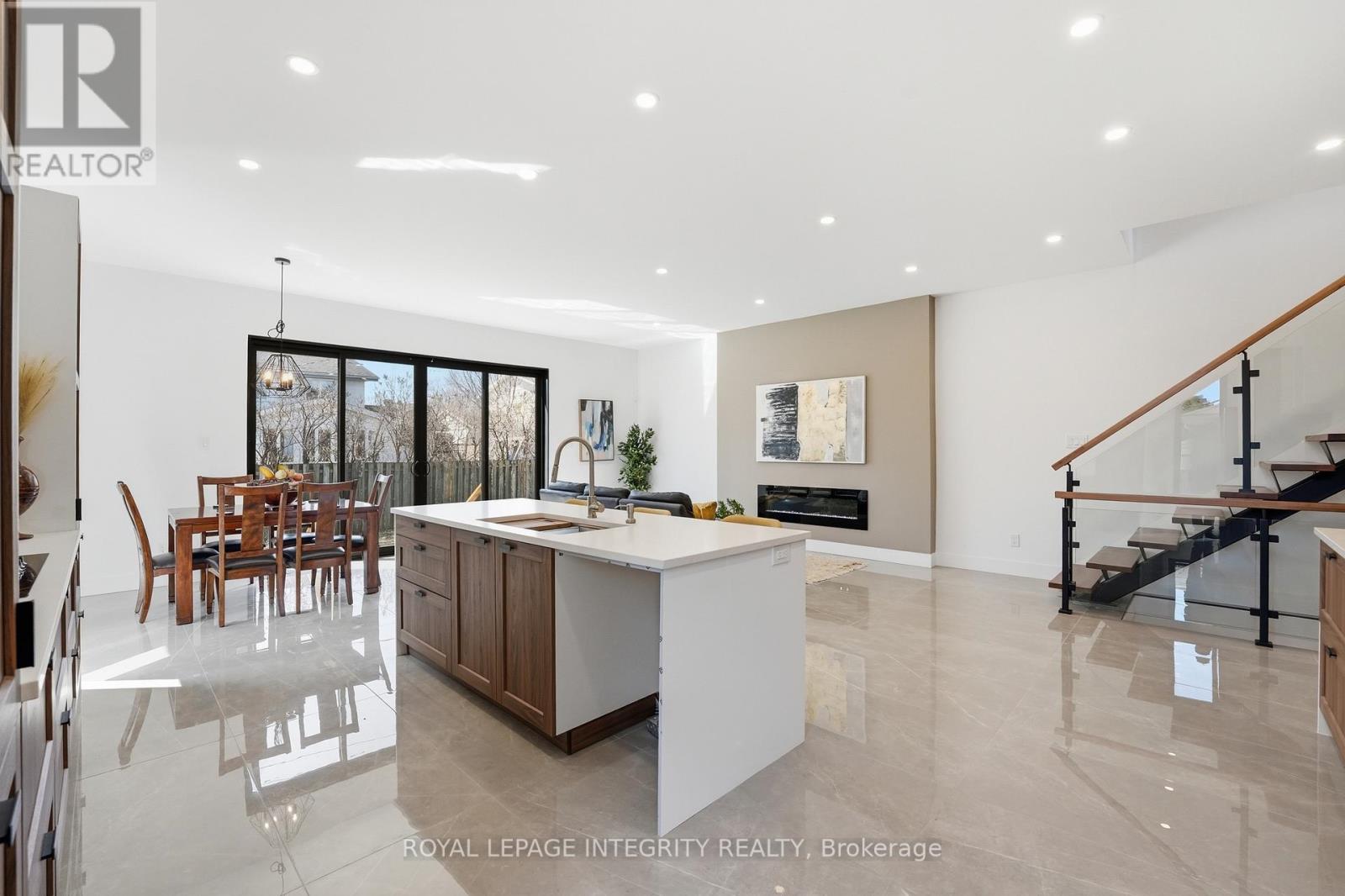 Welcome to 984 Watson Street, a stunning brand new custom semi-detached home that perfectly blends modern design with everyday functionality. Offering over 2,900 sq.ft. of thoughtfully designed living space, this home features 3+1 bedrooms and 3+1 bathrooms, and an attached garage with inside entry. Step into the bright, open-concept main level where large-format flooring, pot lights, and expansive windows create an inviting atmosphere. The designer two-tone kitchen is the heart of the home, complete with quartz countertops, a waterfall island, double wall ovens, sleek cooktop, and ample cabinetry, flowing seamlessly into the dining area and spacious great room with a striking linear fireplace and oversized sliding doors to the yard. A statement open-riser staircase adds architectural flair, while a convenient mudroom/laundry and powder room complete the level. Upstairs, you'll find a versatile loft space ideal for a home office or reading nook, along with three well-sized bedrooms. The primary suite offers a relaxing retreat with a walk-in closet and a beautifully finished ensuite featuring double sinks, a soaker tub, and a separate glass shower. The fully finished basement expands your options with a self-contained setup that includes its own entrance, living space, bedroom, full bath, and kitchenette-ideal for extended family, guests, or added income potential. Located in a family-friendly neighbourhood close to top amenities, minutes to IKEA, Bayshore Shopping Centre, Algonquin College, and Hwy 417, with convenient transit access at Pinecrest Station. Enjoy nearby parks and outdoor spaces including the Ottawa River Pathway, Elmhurst Park, Frank Ryan Park, and Britannia Beach. (id:50982)
